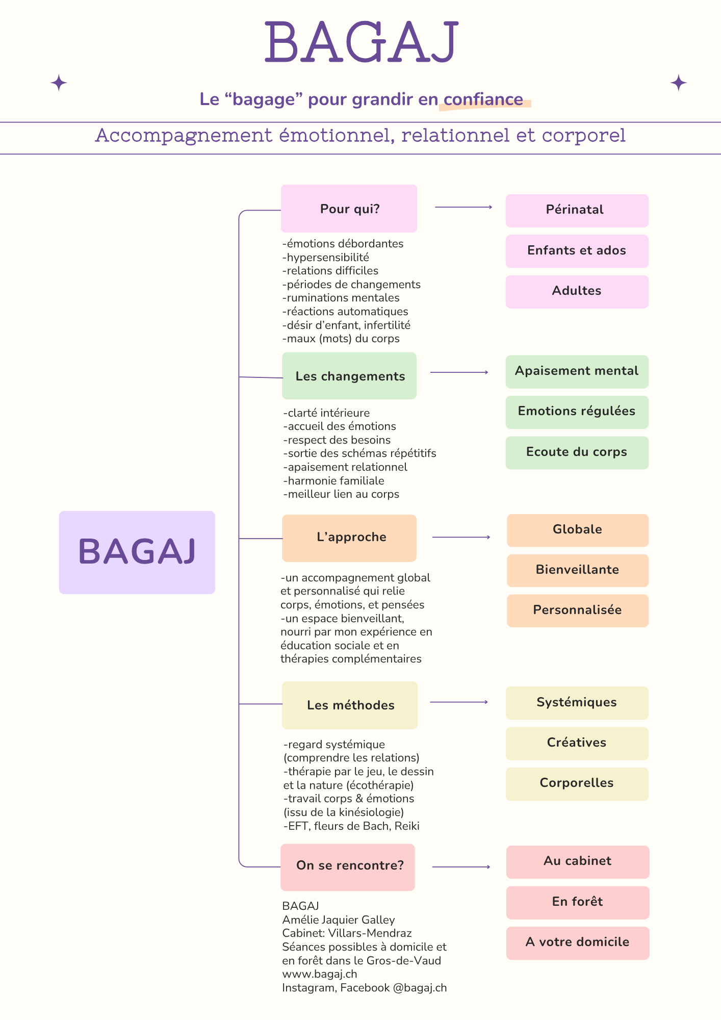 BAGAJ est une approche unique née de mon expérience en éducation sociale et en thérpaie complémentaire. Mon approche réunit des outils puissants et cohérents pour accompagner en profondeur les émotions, le corps et les relations.